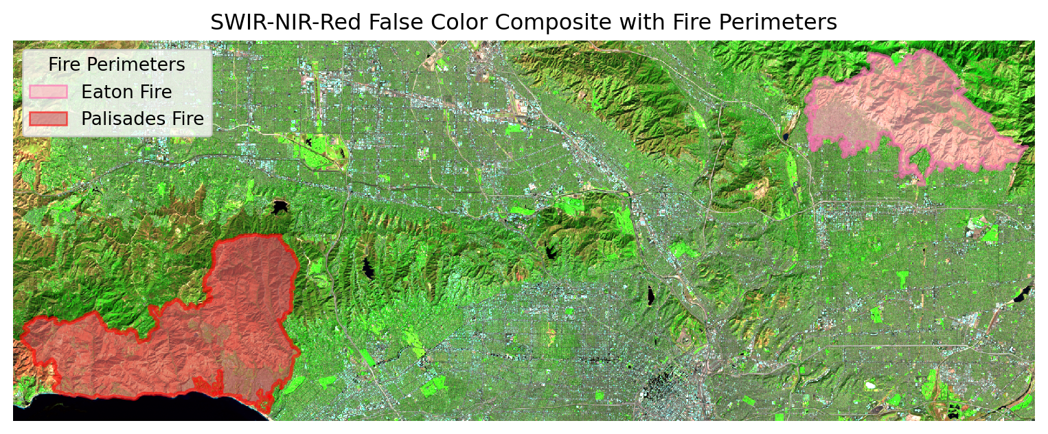 An analysis of the 2025 Eaton and Palisades wildfires using Landsat satellite imagery and Environmental Justice Index data, visualizing fire perimeters, vegetation impacts, and social vulnerability in affected communities